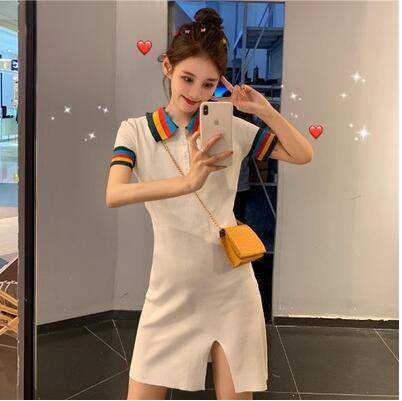 小清新polo彩虹领短袖针织连衣裙