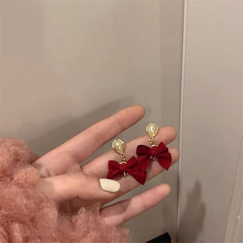 925银针水滴形珍珠蝴蝶结耳环女小众设计感气质耳坠秋冬复古耳饰