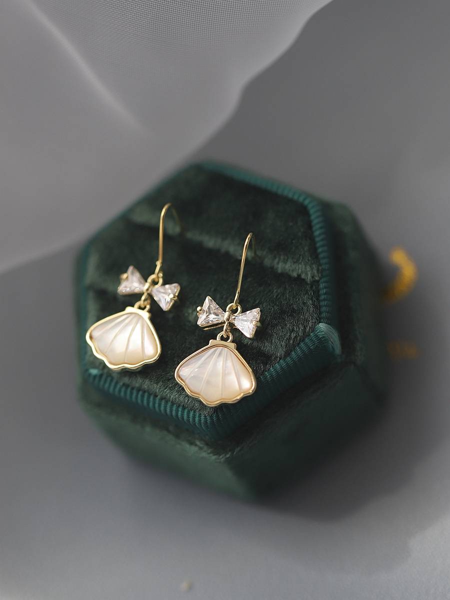 蝴蝶结贝壳耳环2021年新款潮韩国气质网红贝母耳勾锆石扇形耳坠女
