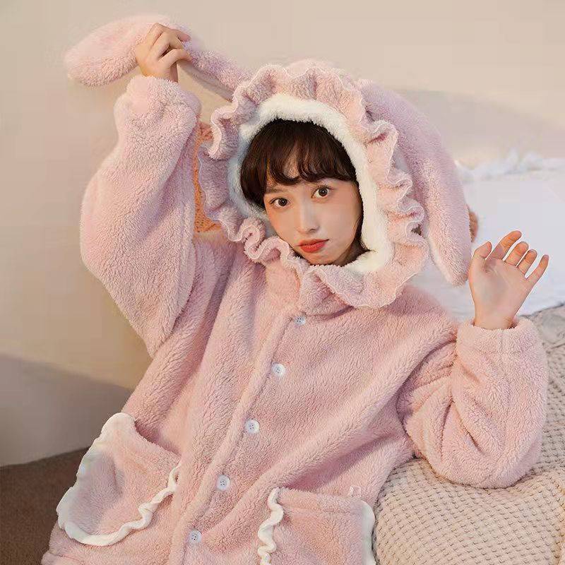2021冬季新款加厚连帽长毛绒长袖睡衣套装