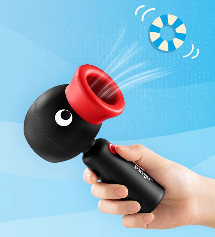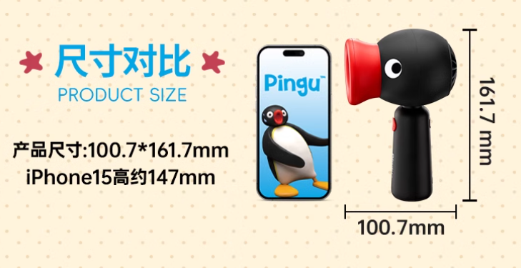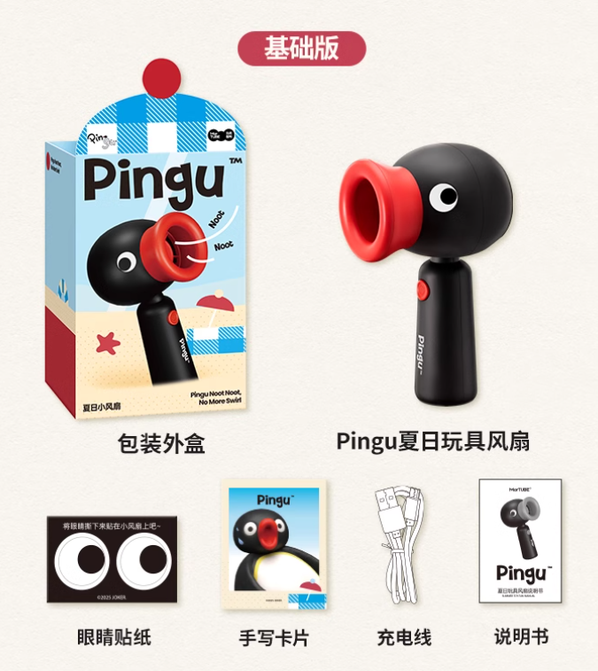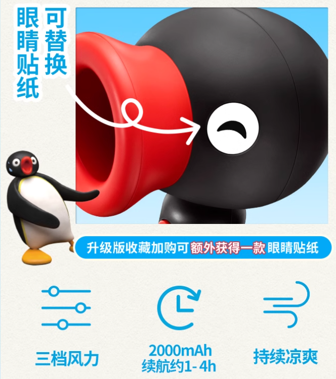以经典企鹅Pingu为原型,红色喙部+黑色躯体萌趣吸睛。头部可180°旋转调节风向,底座印有品牌烫金标识,礼盒包装自带收藏价值。