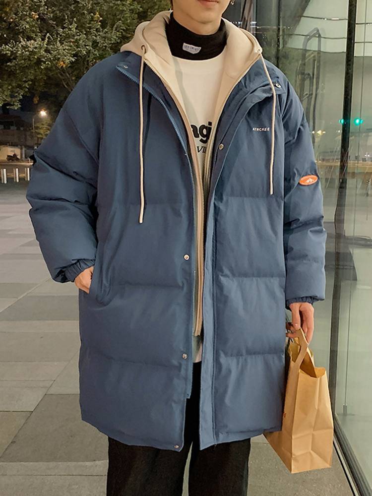 男装中长款棉衣男士潮牌假两件连帽羽绒棉服冬季加厚过膝棉袄