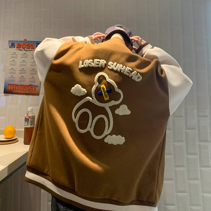 2021秋冬加绒卡通小熊毛巾刺绣棒球服男外套潮牌撞色拼接夹克
