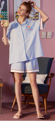 哆啦A梦睡衣女夏季格子翻领夏套装短袖睡衣女2021新款