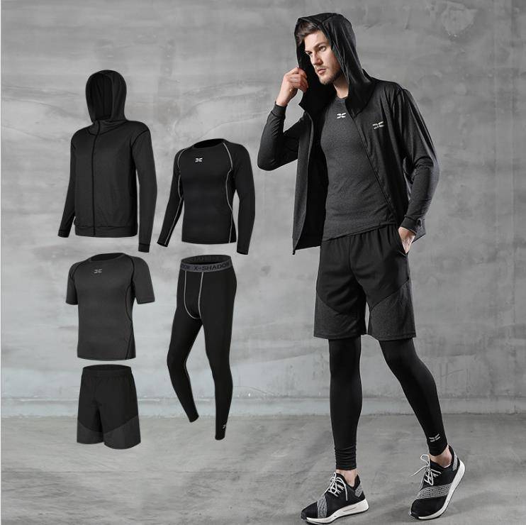 黑色运动套装男士跑步健身服五件套短袖外套速干t恤运动衣服大码