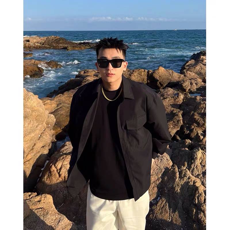 SANBAI 叁佰2022春季黑色工装衬衫男 极简设计男士衬衣宽松外套潮