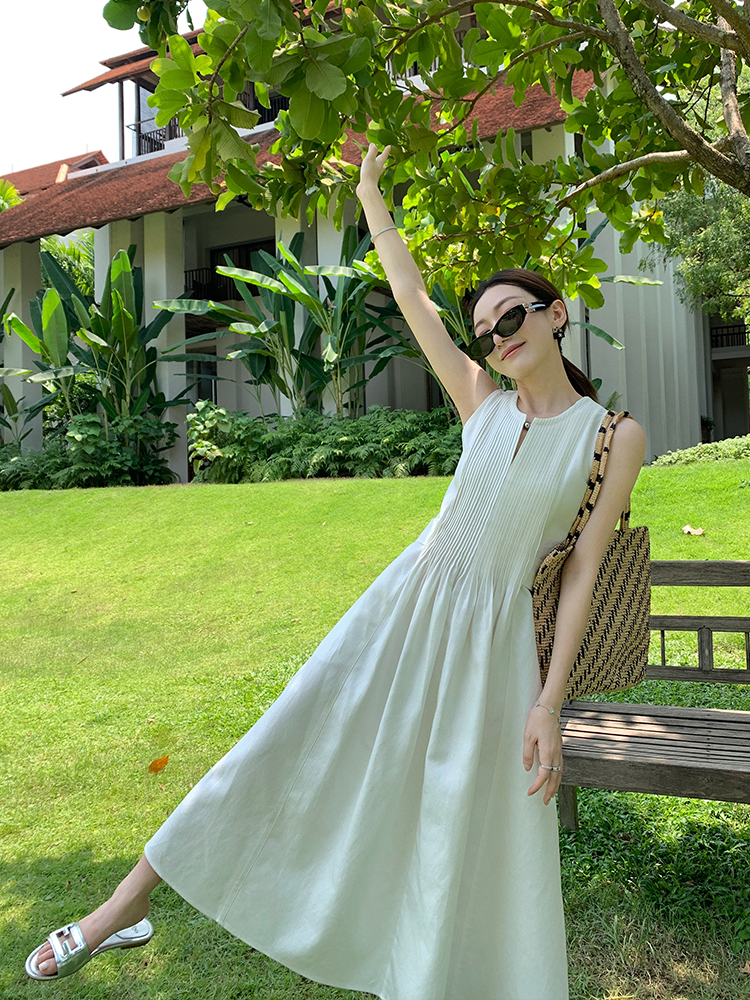 亚麻连衣裙女法式重工压褶高级感无袖背心裙夏