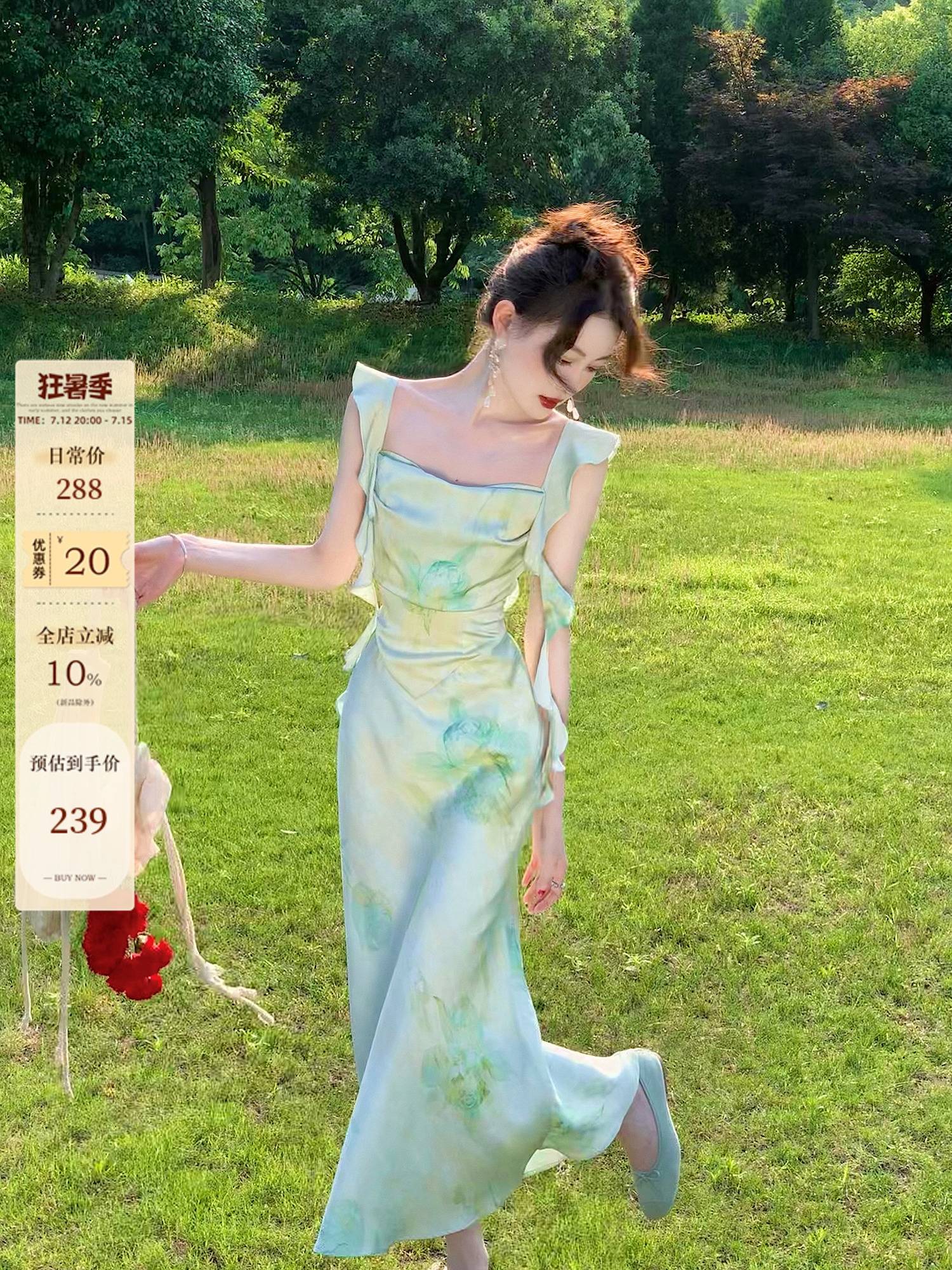 法式油画风荡领连衣裙女夏季缎面设计感裙子