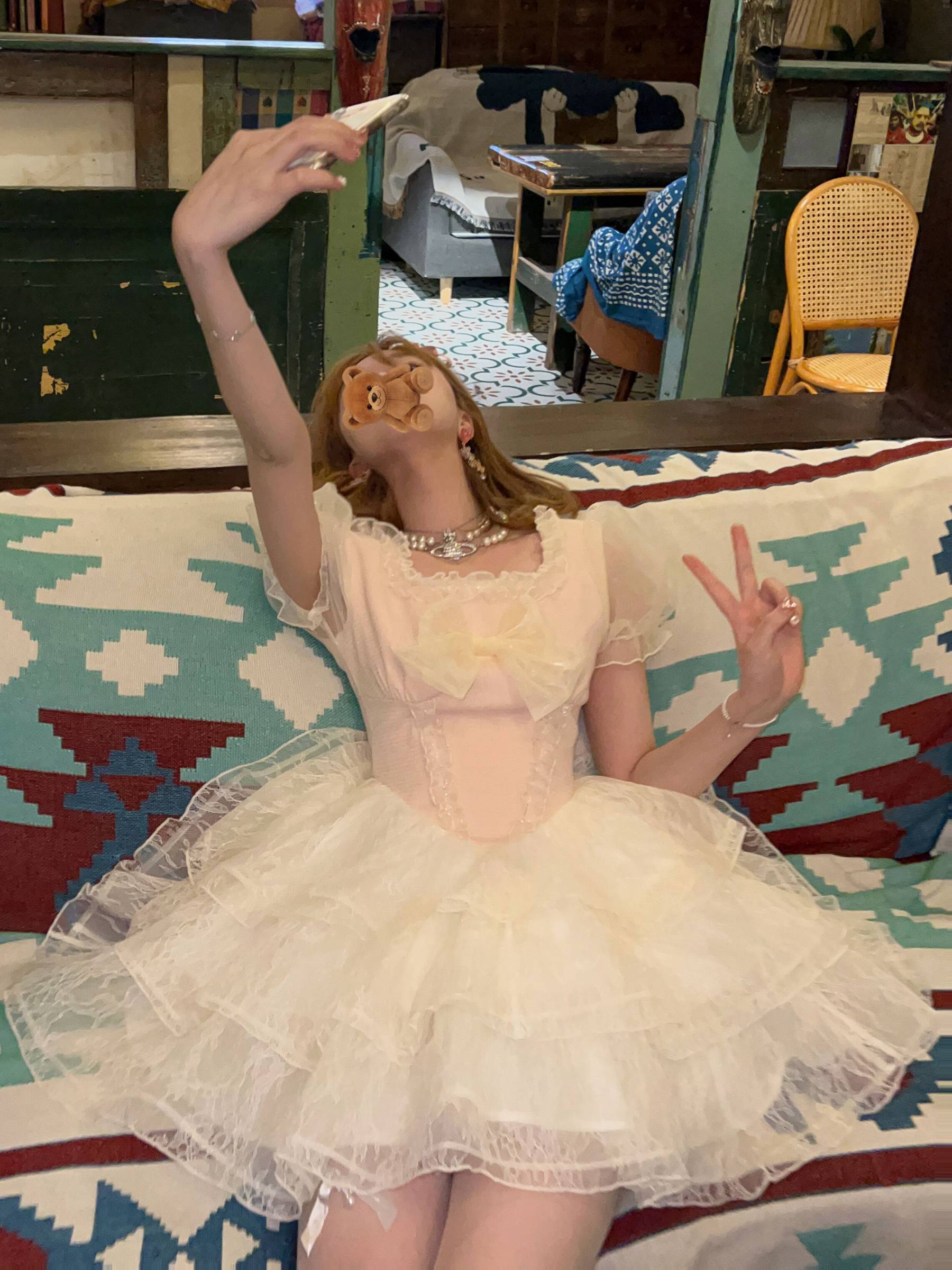 森女系原创想去海边 草莓恋歌 甜甜蝴蝶结粉米色拼接连衣裙