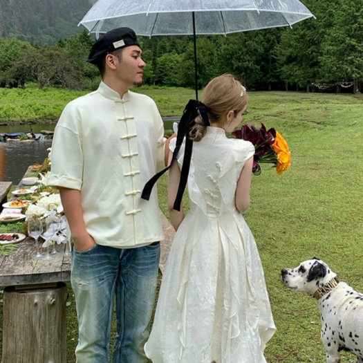 新中式盘扣2023纯色设计感开叉连衣裙情侣套装