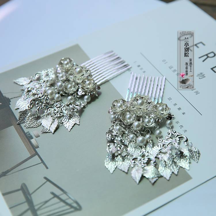 香雪海发梳版 手工汉服配饰银叶子珍珠流苏发饰古装头饰兰亭别院
