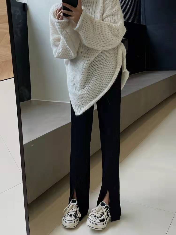 2021年秋冬新品百搭显瘦针织开叉直筒裤女潮高腰时髦垂感休闲长裤