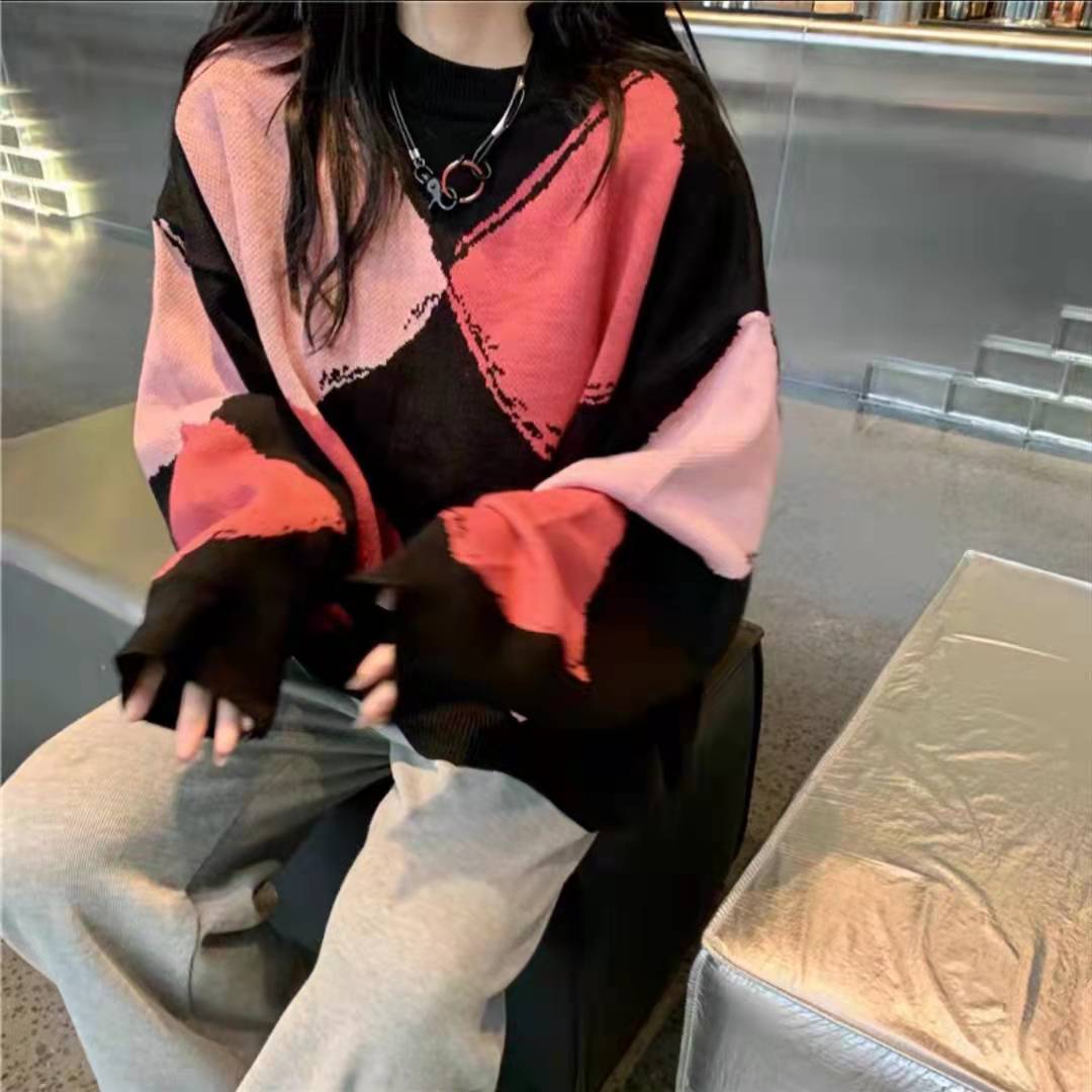 2021年秋装新款复古宽松慵懒风毛衣涂鸦菱格可爱长袖针织衫上衣女