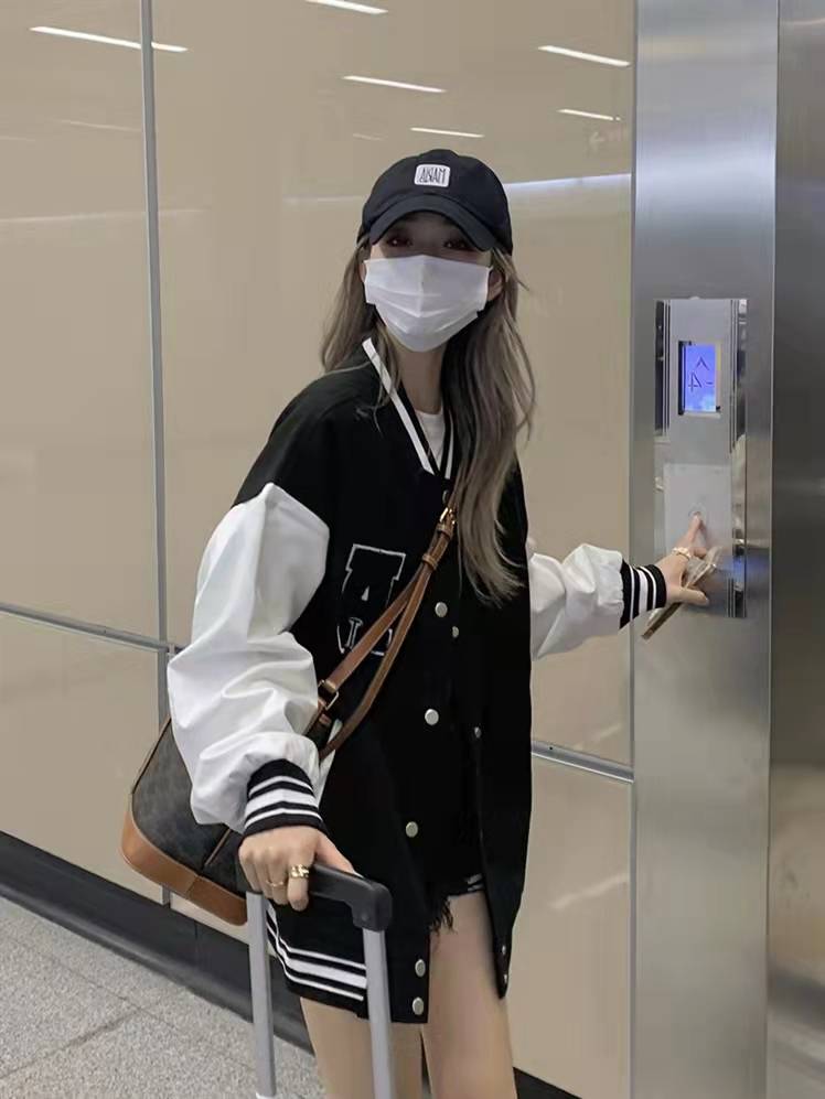 vintage黑色棒球服女春秋薄款百搭韩版宽松撞色高街夹克外套ins潮