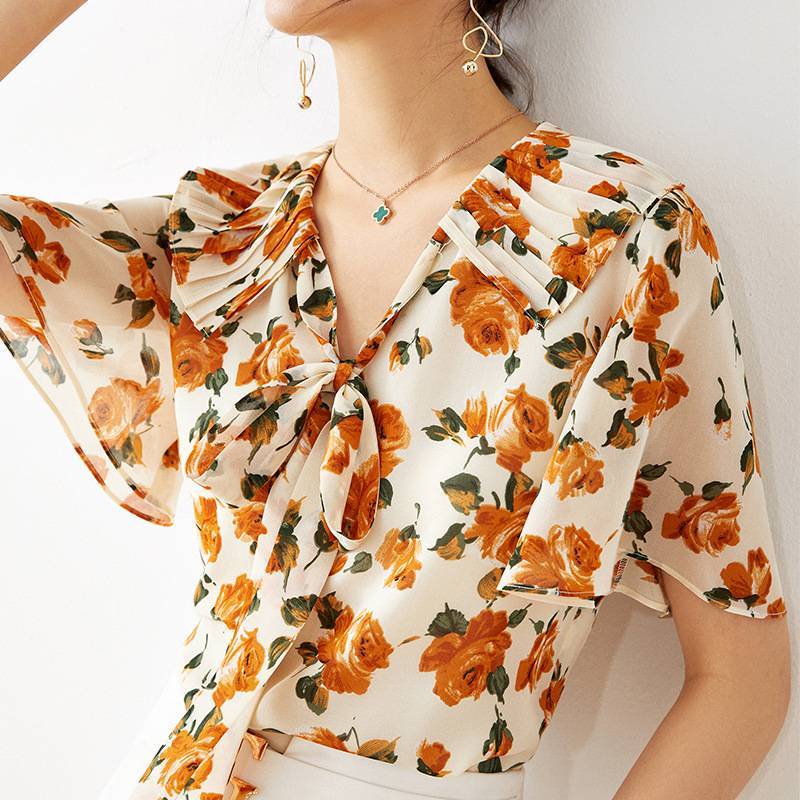 2022夏季新款十三行女装批发海军领碎花印花雪纺衬衫短袖女式上衣 69.00 已售:0件