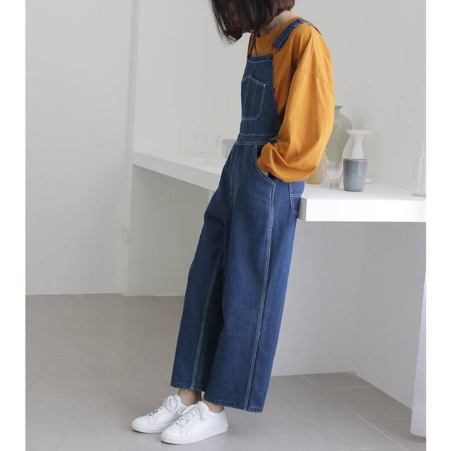 2018韩国秋冬深蓝牛仔背带阔腿裤 新款宽松直筒工装风女装长裤