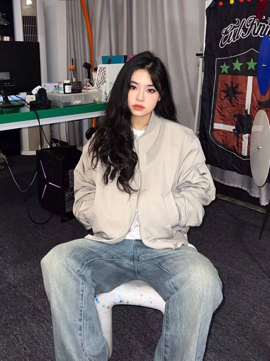 美式复古灰白飞行员棒球棉服外套女秋冬国潮ins短款工装夹克棉衣