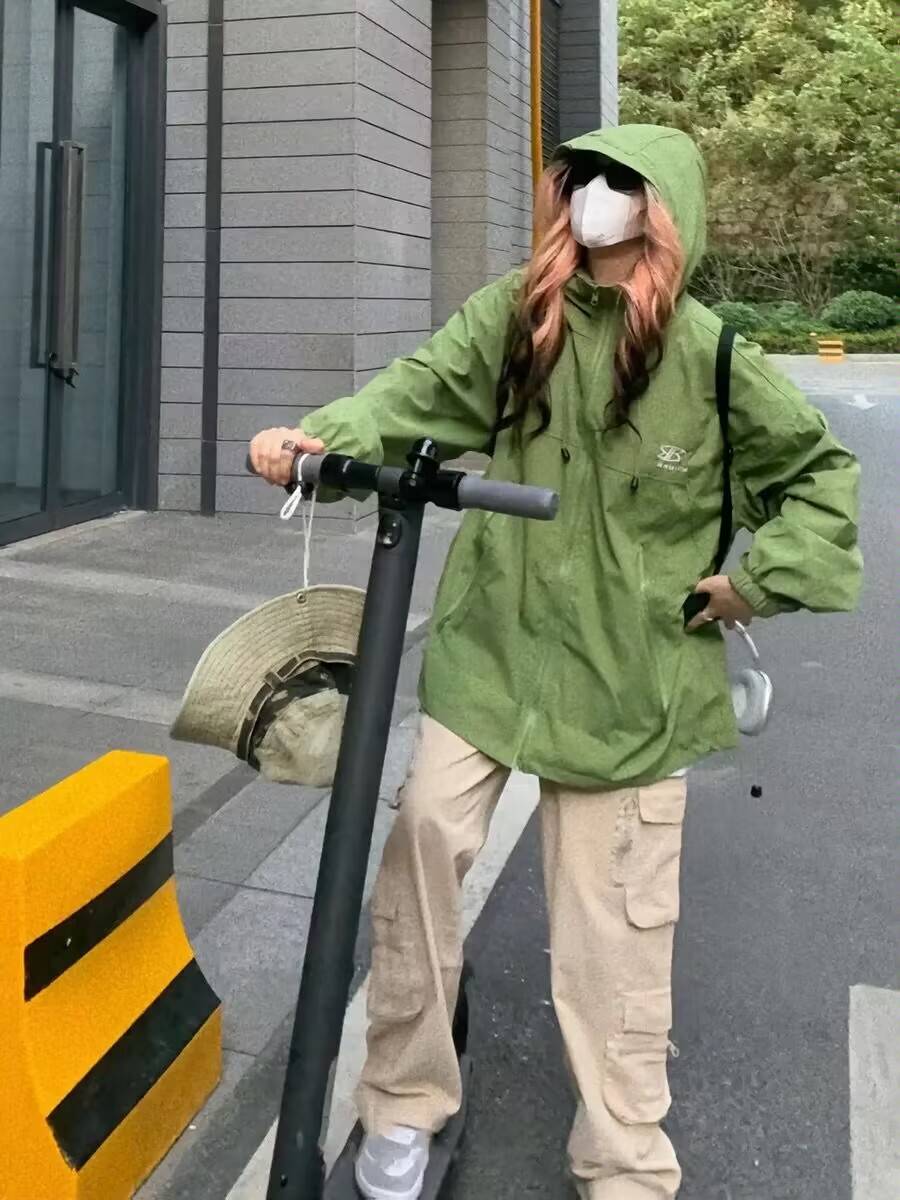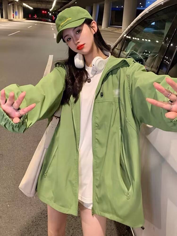 潮牌绿色冲锋衣女款2022秋季爆款情侣设计感拉链连帽机能风衣外套