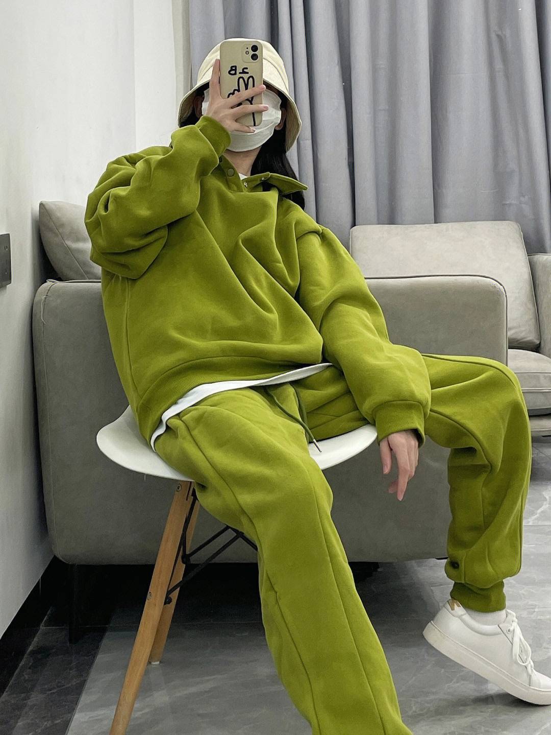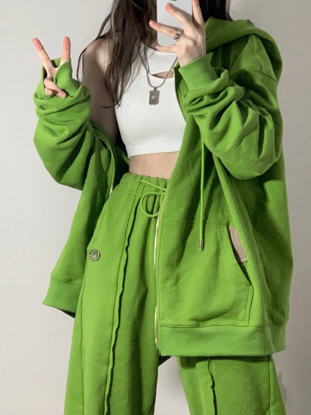 街头嘻哈oversize绿色运动服套装女春季宽松美式阔腿裤休闲两件套