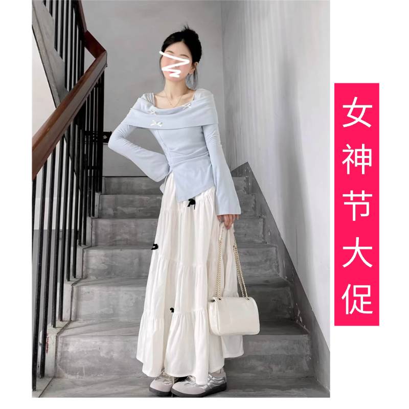 春季温柔风韩系穿搭一整套蓝色连衣裙子女装2025新款气质长裙套装