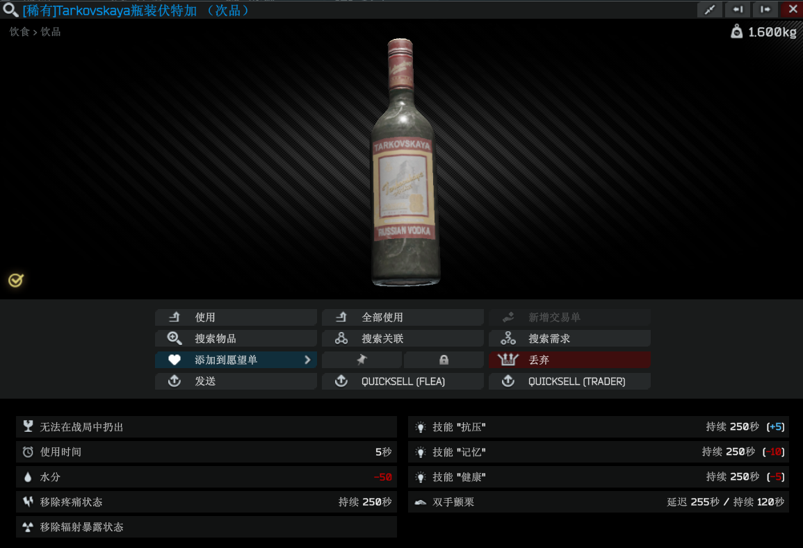塔科夫斯卡娅火焰水,原则上不建议使用,酒精是有害的,但有时战斗过后很需要放松。毕竟,喝了之后不需要冲进51区就可以看到外星人。