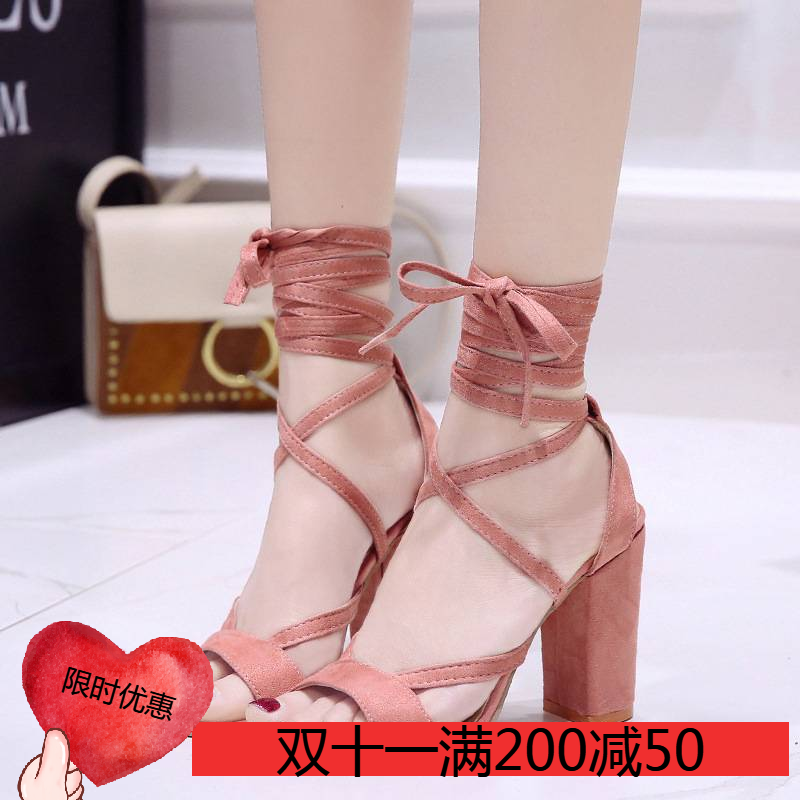 欧美时尚夏季脚环绑带个性女凉鞋粗跟绒面鱼嘴高跟凉鞋女鞋潮批发
