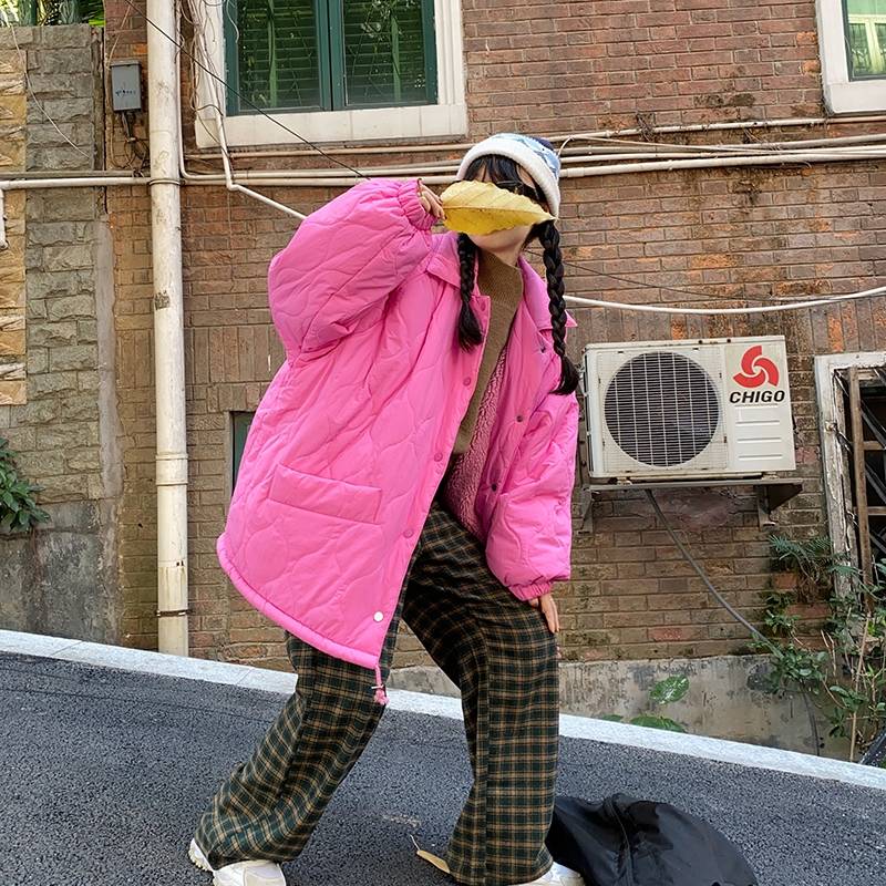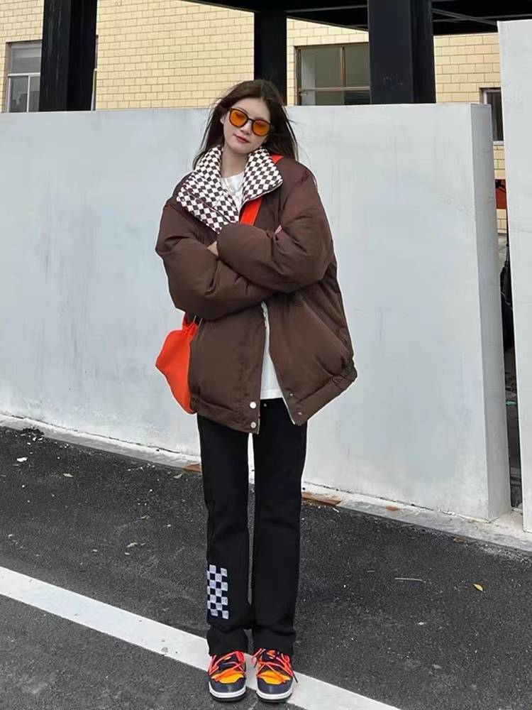 冬季棋盘格外套棉服女ins港风棉袄2021年新款韩版宽松加厚棉衣潮