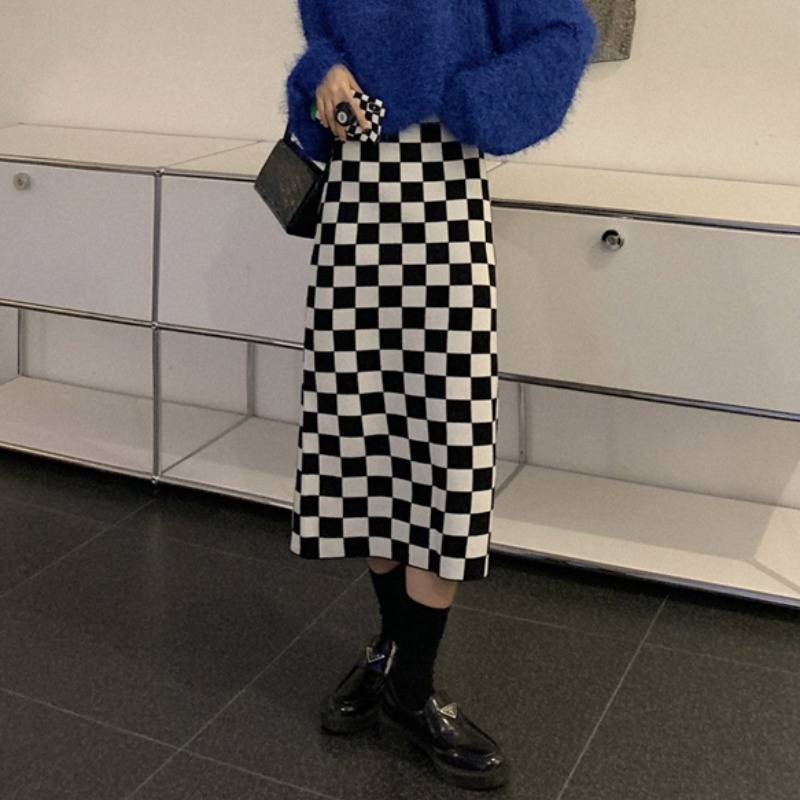 冬天配毛衣棋盘格半身裙子秋冬2021新款女设计感小众长裙a字半裙