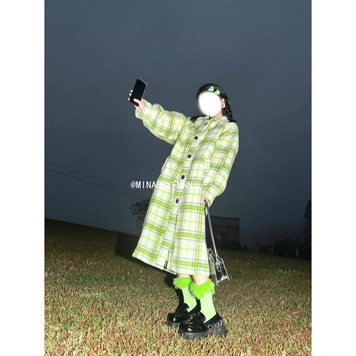 绿色毛呢大衣女冬季新款韩版宽松复古格子加厚呢子中长款过膝外套