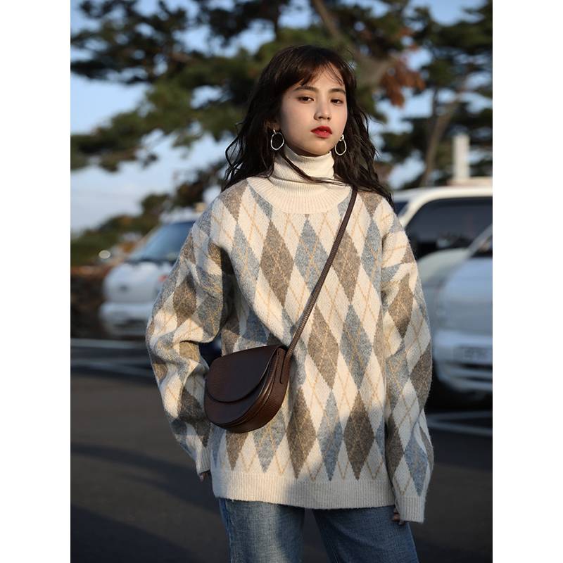 2019新款秋冬加厚慵懒风宽松韩版外穿套头复古港味菱格毛衣女外套