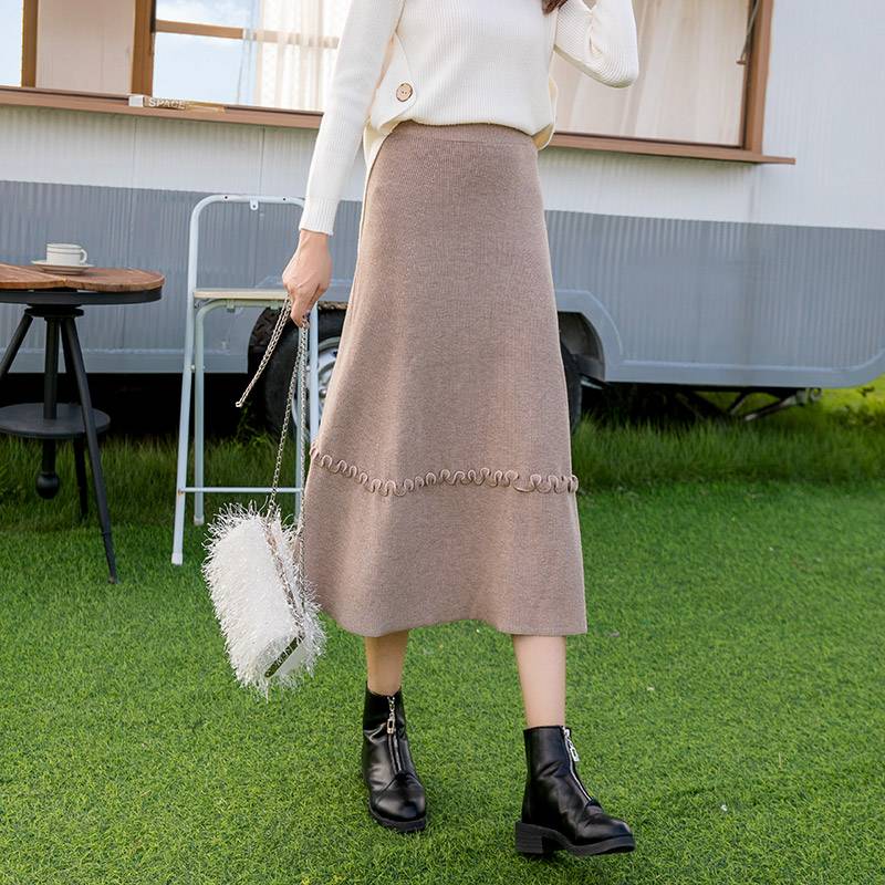 针织半身裙初秋女秋冬季高腰a字长裙过膝盖加厚中长款木耳毛线裙