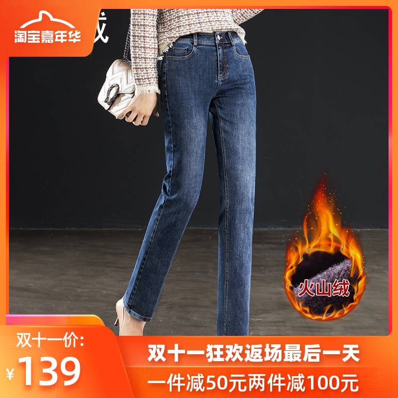 雅思诚女裤2019冬季新款宽松牛仔裤秋冬女直筒高腰显瘦裤子冬加绒