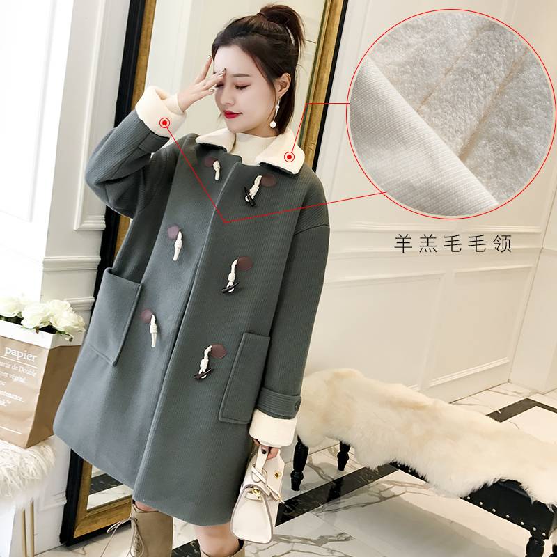 牛角扣呢子大衣女中长款2019新款冬季学院风小个子羊角扣毛呢外套