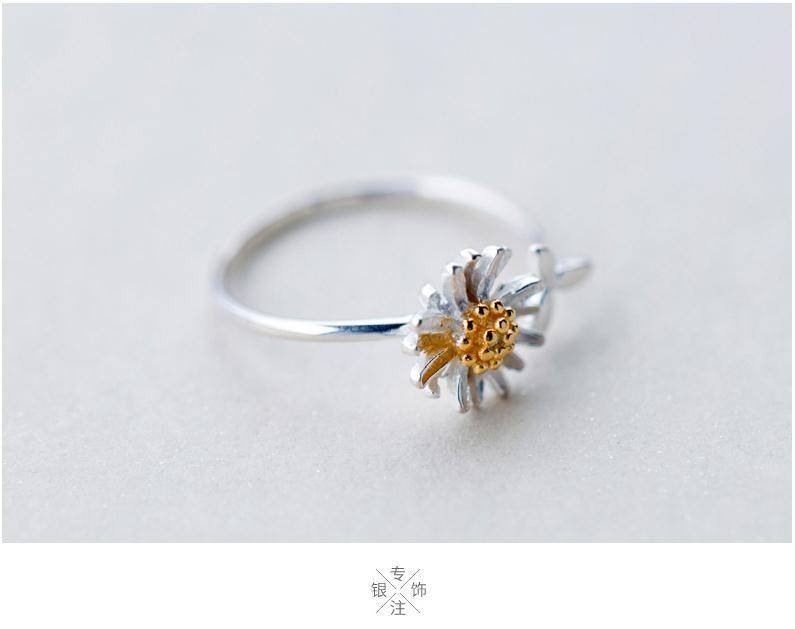 S925银戒指女韩版森系银镀金雏菊戒指可爱小树叶开口戒指女