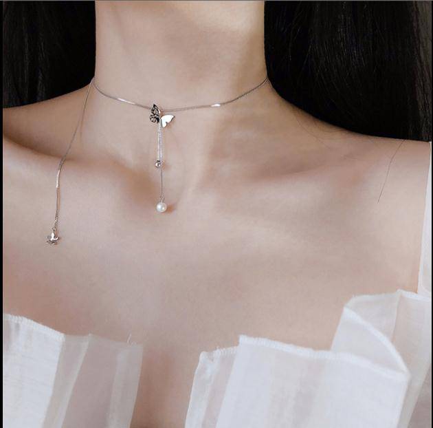 蝴蝶珍珠流苏项链女通体925纯银长款锁骨链网红INS冷淡风配饰