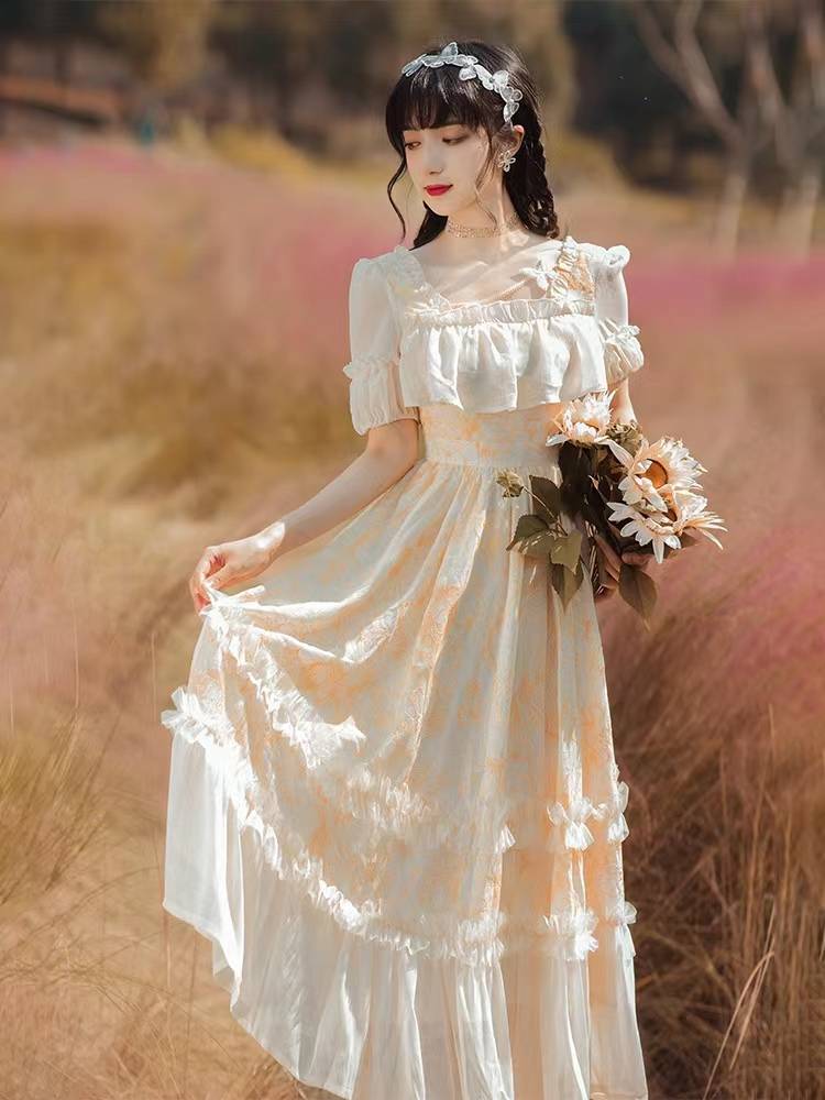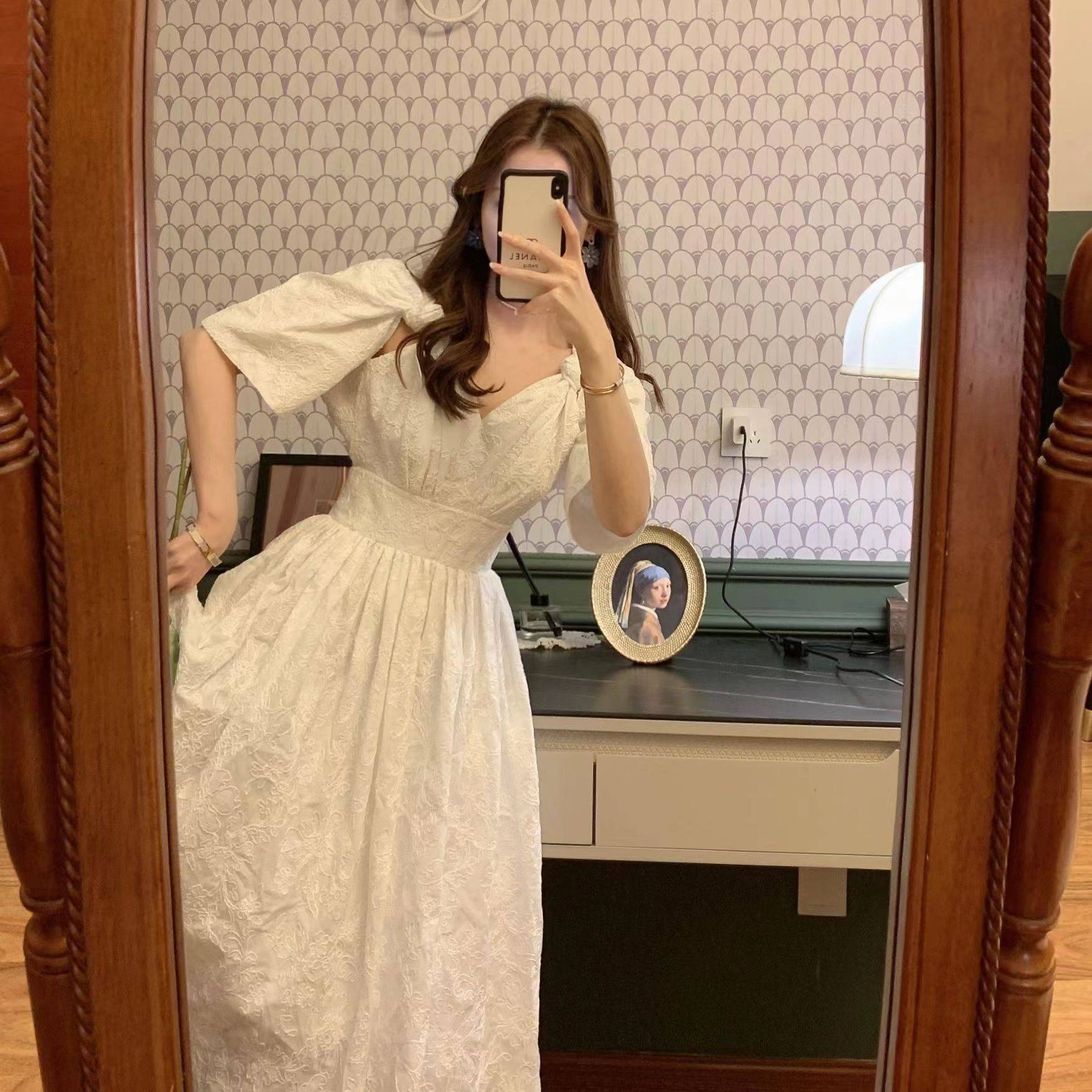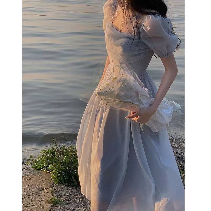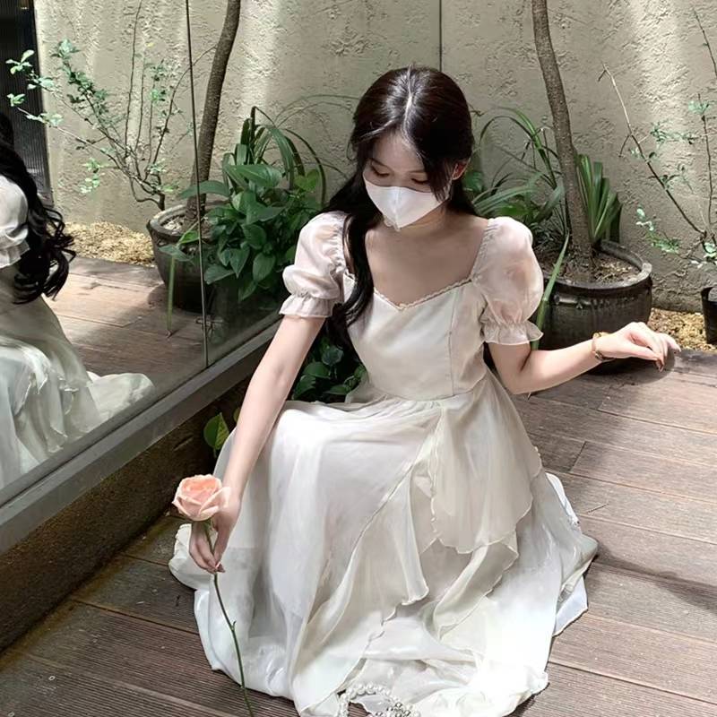 2022夏季新款法式复古甜美初恋温柔风方领连衣裙仙女超仙森系裙子