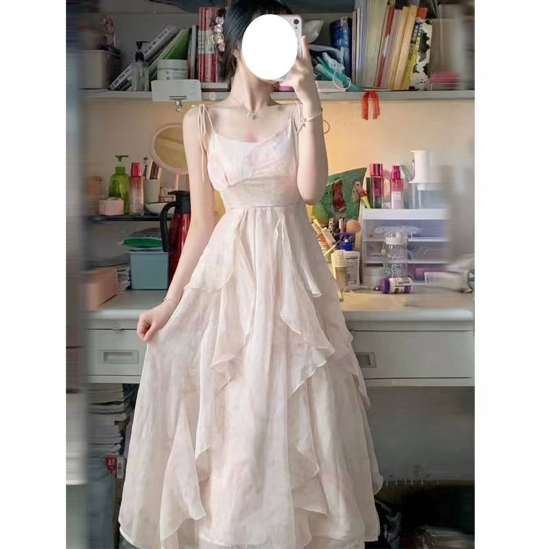 糯米家粉色吊带连衣裙女夏法式清纯长裙子不规则荷叶边聚会仙女裙