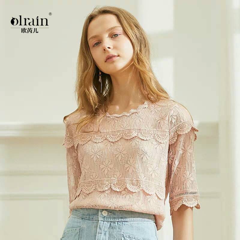 2019年夏装新款五分袖绣花荷叶边小衫女粉色蕾丝衫