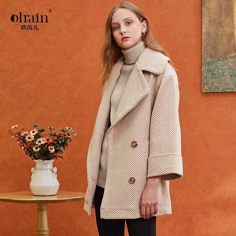 欧芮儿冬新款翻领条纹毛呢外套女中长款