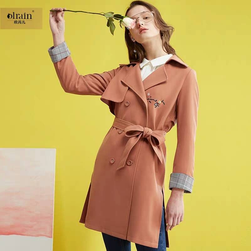 欧芮儿春装2019款女装宽松双排扣长袖风衣外套女中长款刺绣chic风