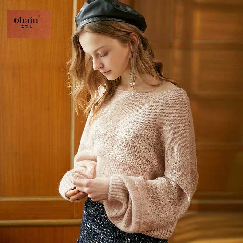 欧芮儿秋装 宽松显瘦长袖镂空套头粉色灯笼袖毛衣女秋冬