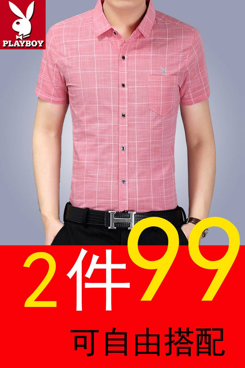 夏季花花公子短袖衬衫男中年宽松纯棉格子衬衣爸爸装休闲免烫衣服