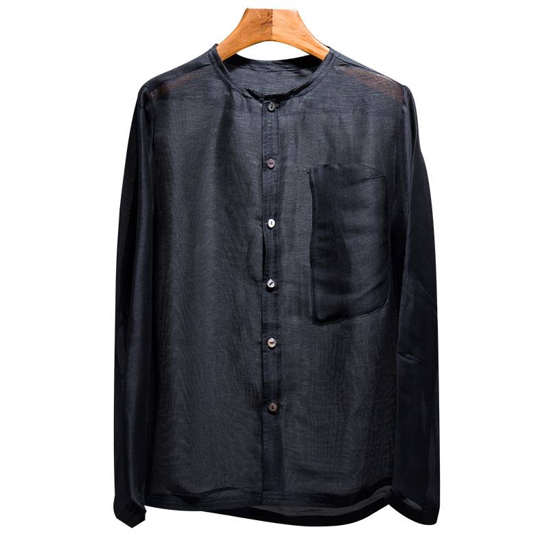 素我春 男装微中式单农原创设计无领真丝麻罩衫长袖衬衫上衣