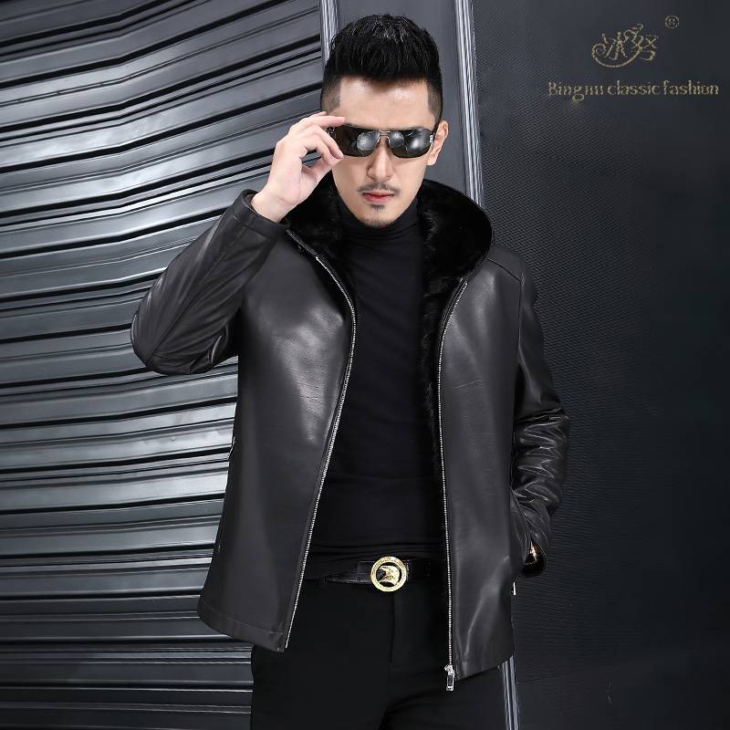 新款海宁皮衣男夹克修身韩版连帽帅气冬水貂内胆真皮皮毛一体青年