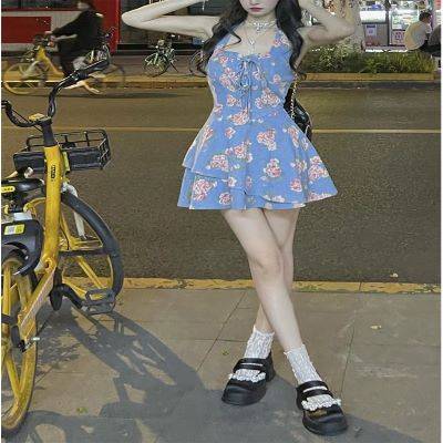 捣蛋甜心 复古玫瑰印花挂脖牛仔连衣裙系带收腰显瘦裙子