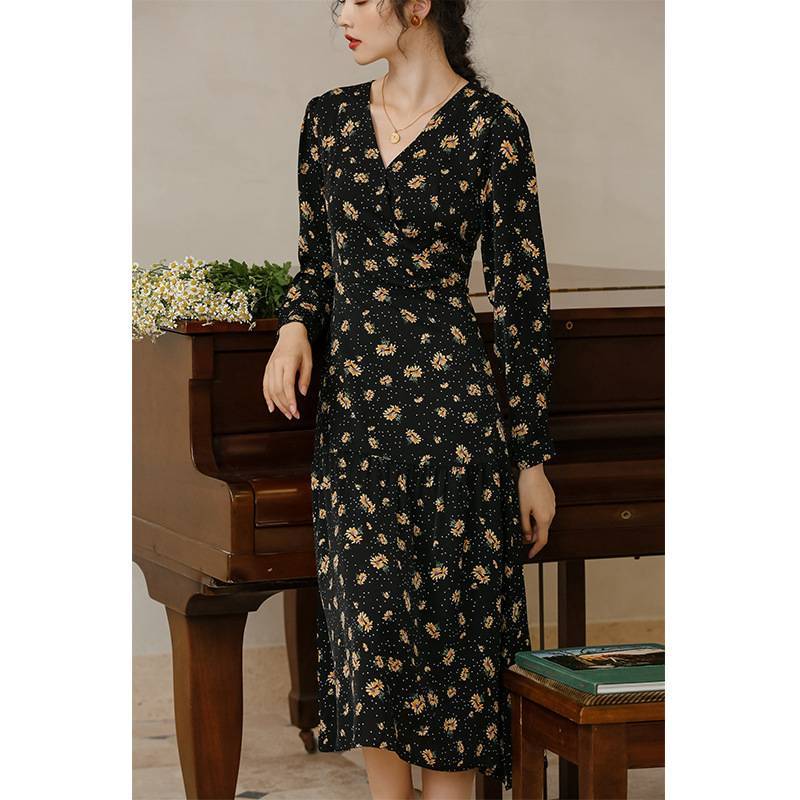 2020春复古v领长袖中长款小雏菊碎花雪纺连衣裙秋季裙子女