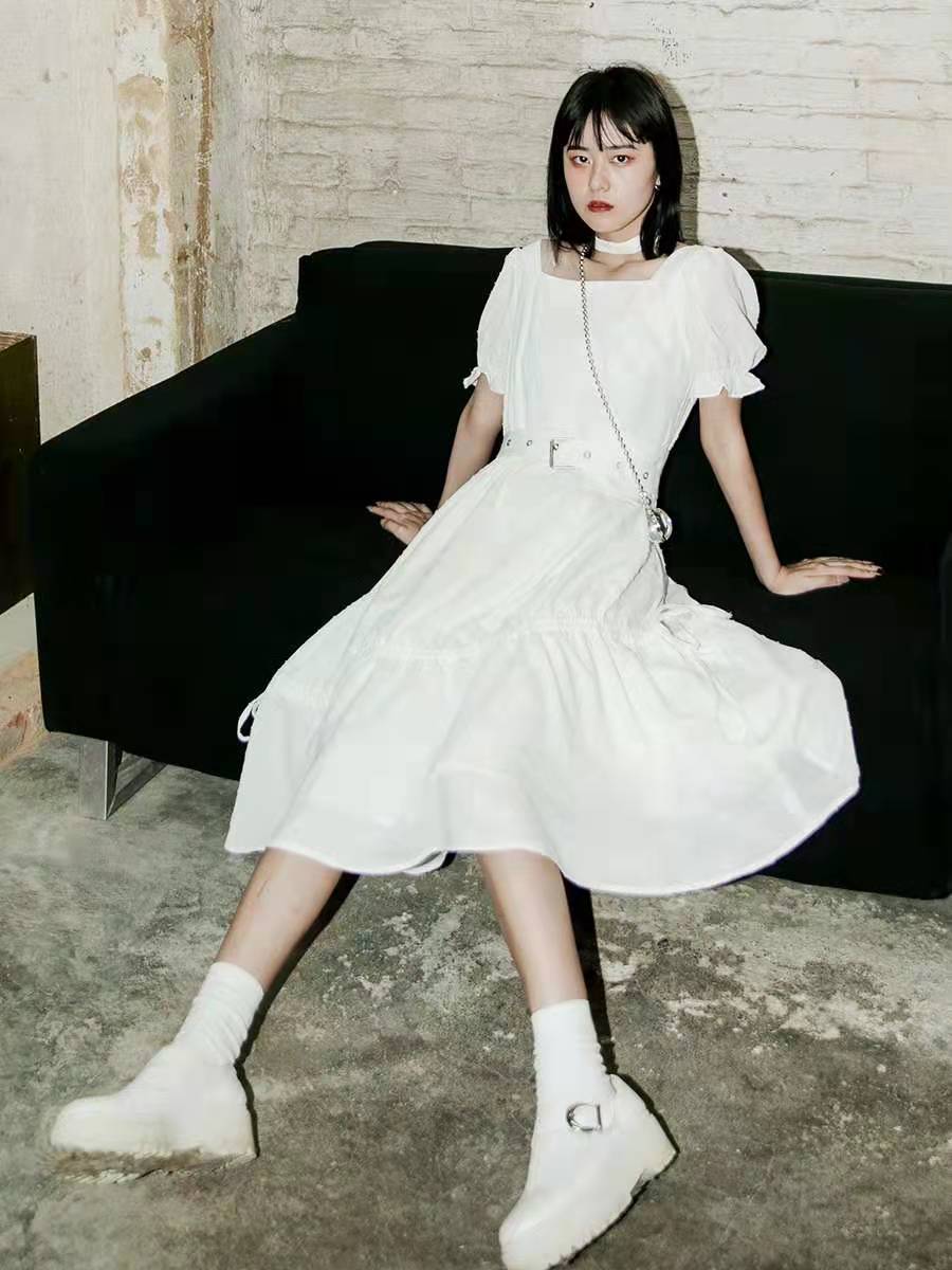 法式泡泡袖提花方领连衣裙