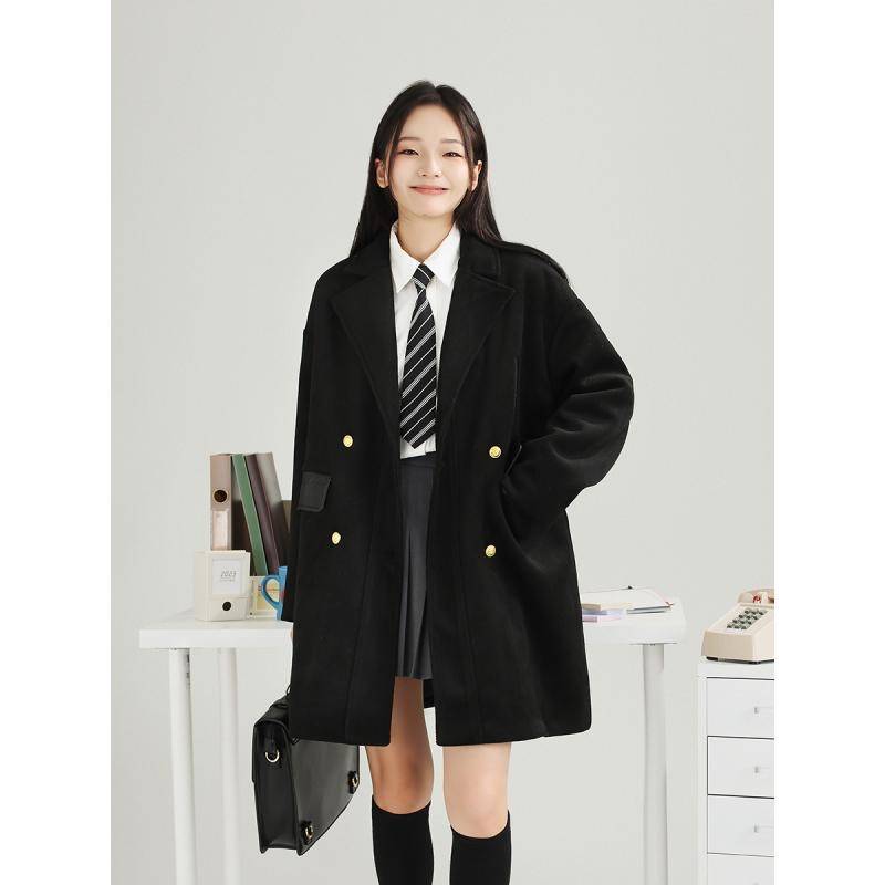 DESSUU赫本风大衣女2023冬季学院风黑色高级毛呢外套加厚夹棉西服
