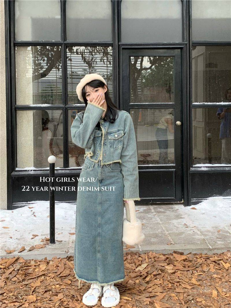 辣妹复古水洗短款牛仔外套春季2023新款高腰长款半身裙牛仔裙套装