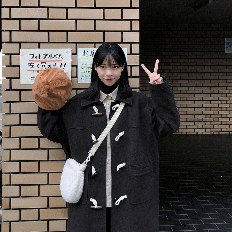 奶兔星球 日系学院风大翻领薄棉毛呢外套女中长款牛角扣大衣